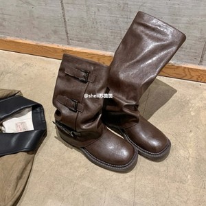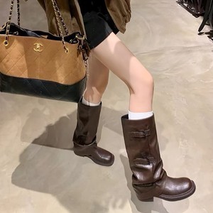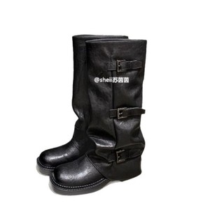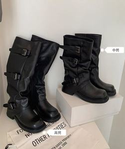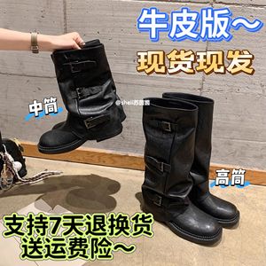 牛皮版辣妹裤管靴增高皮扣带圆头厚底中筒西部骑士长靴堆堆短靴女