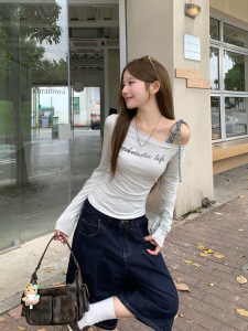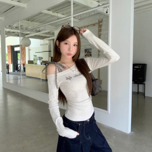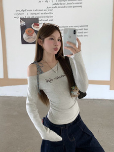 设计感花灰斜肩格子绑带内搭t恤女秋季字母印花新款修身长袖上衣