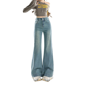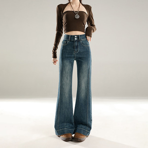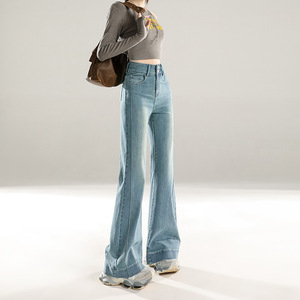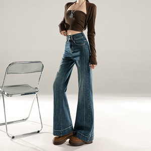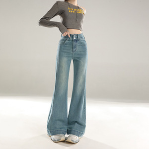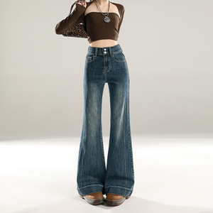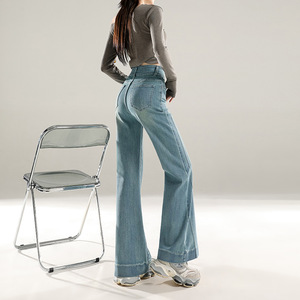 稚橘#复古拼接设计收腹阔腿微喇牛仔裤女修身显瘦弹力百搭拖地裤