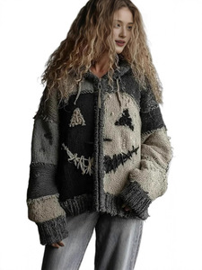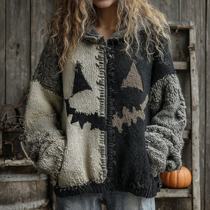 跨境秋冬新款欧美风万圣节恶搞数码印花拉链款南瓜连帽仿针织毛衣