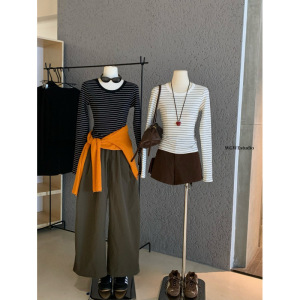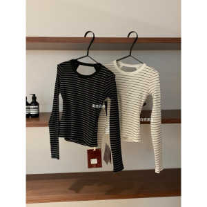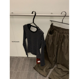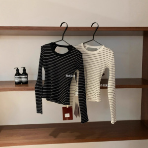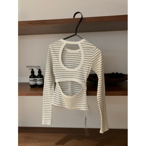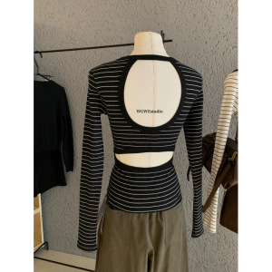 塞纳WGWE7084早秋新款韩系设计感露背镂空修身打底长袖条纹T恤女