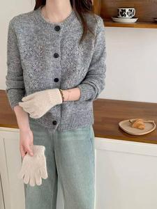 粉色刺绣针织长袖圆领开衫外套女韩系春秋上衣宽松气质百搭短毛衣