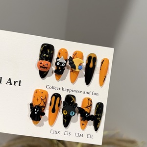 纯手工穿戴甲高级感秋冬季橘黄色美甲片万圣节南瓜蝙蝠假指甲贴片
