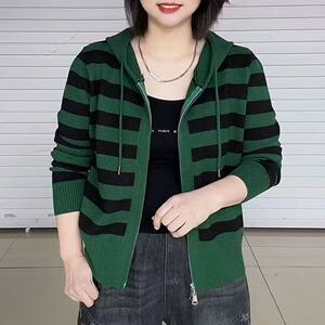 网红新款简约条纹印花气质减龄开衫宽松休闲连帽针织妈妈秋季外套