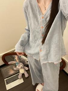 温柔风韩系简约褶皱装饰睡衣女士春秋季休闲大码家居服套装可外穿