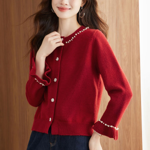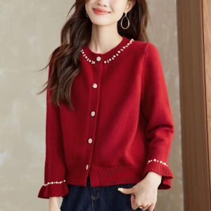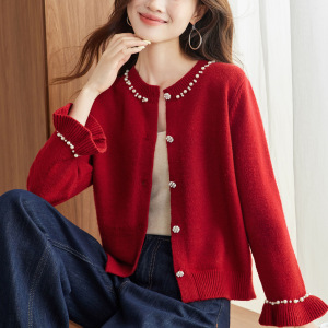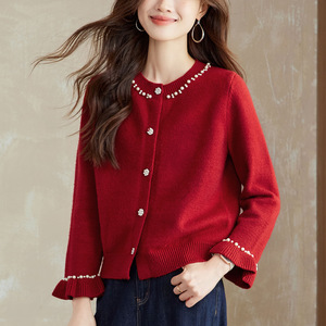 红色针织开衫春秋大码胖mm漂亮减龄上衣显瘦宽松短款女士毛衣外套