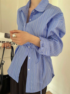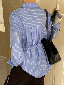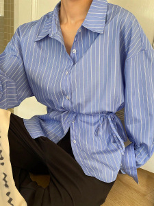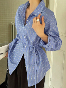 瑞逅跨境欧美气质条纹长袖衬衫2025秋季独立站外贸系带条纹衬衣女