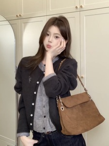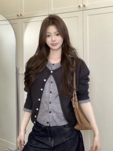 韩系假两件撞色针织开衫女秋季小个子修身软糯高级感刺绣毛衣外套