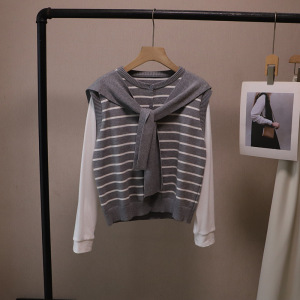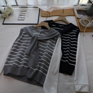 [比正]2025秋季新款韩版拼接假两件时尚披肩条纹百搭针织衫女5089