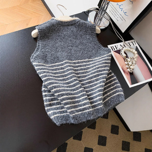 韩系撞色条纹圆领无袖背心女2025秋冬新款设计感叠穿针织毛衣上衣