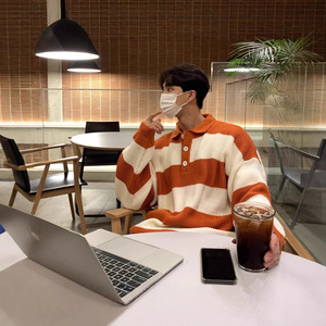 条纹毛衣男高级感宽松复古日系慵懒潮牌翻领针织衫韩系休闲外套
