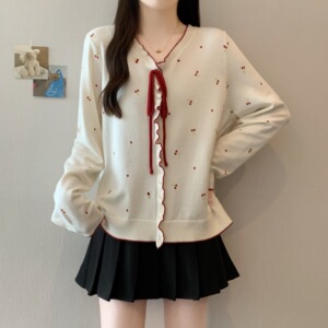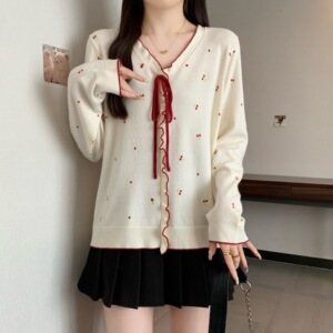 实拍2025秋装胖mm大码女蝴蝶结系带V领长袖针织衫甜美风上衣69353