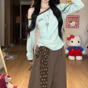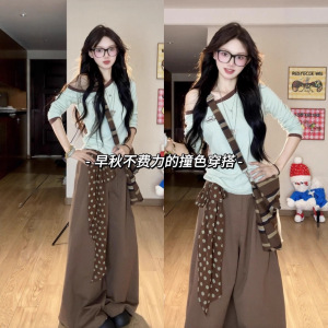 韩系绿色小清新斜肩长袖t恤女秋季小个子修身显瘦撞色打底衫上衣