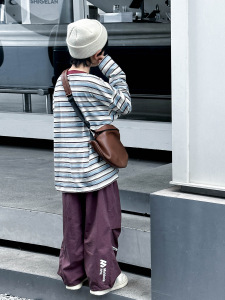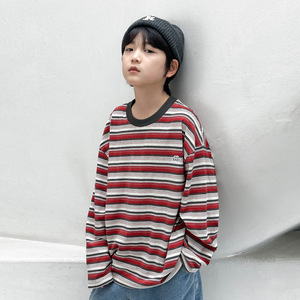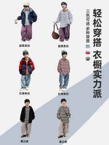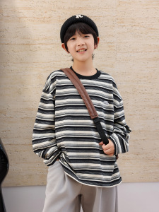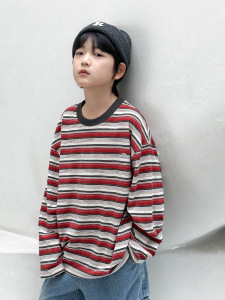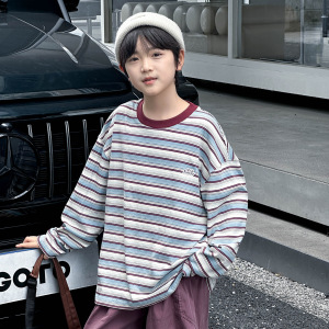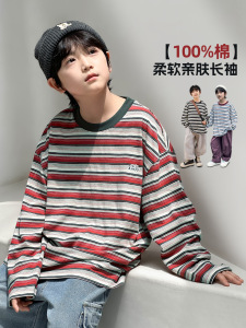 熊猫圆圆男童长袖条纹t恤纯棉 2025新款撞色领儿童打底衫秋装上衣