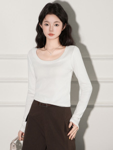 季优U领纯棉正肩长袖打底小衫t恤女基础款修身秋冬大领口内搭上衣