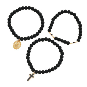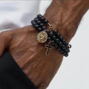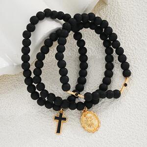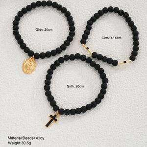 跨境新款男士串珠手链套装地图石黑胆石十字架手链弹力三件套手链