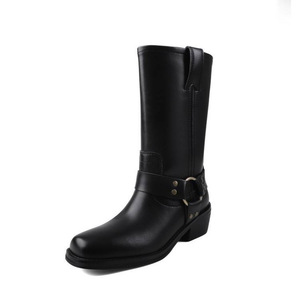 欧美气质复古皮带扣西部靴女2025新款真皮方头粗跟中筒靴骑士靴