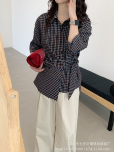 琪镌绘制韩系格子长袖衬衫女装秋季新款宽松系带百搭衬衣上衣651