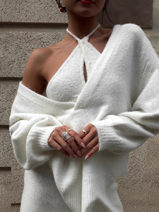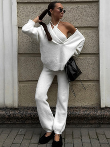 跨境v领套头针织套装女套头深v上衣挂脖露肩背心宽松束脚裤三件套