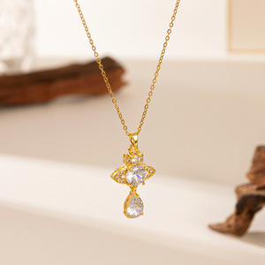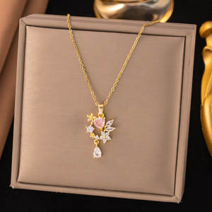 【8277】铜吊坠—粉钻花朵水滴 项链【金色】