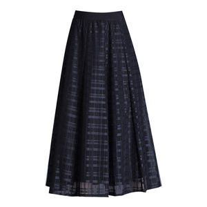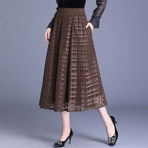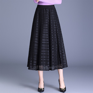 格子网纱半身裙女秋2025新款百褶裙中长款高腰a字裙气质大摆伞裙