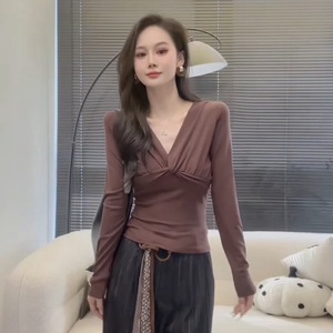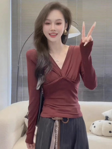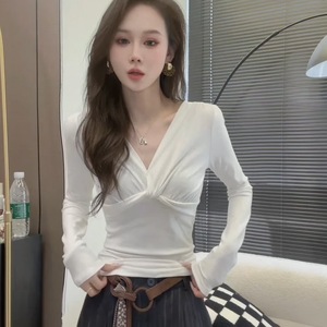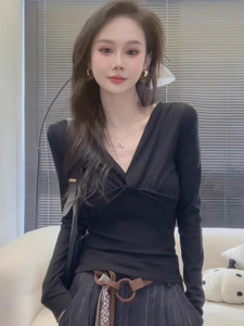 设计感纽扣V领长袖T恤女2025秋装新款气质内搭打底衫修身别致上衣