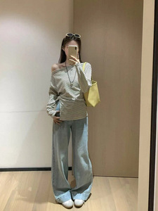 设计感别致撞色条纹斜肩上衣女2025早秋新款修身显瘦长袖露肩t恤