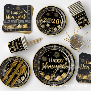 2026新年黑金派对装饰布置跨年狂欢一次性纸盘纸杯纸巾餐具套装