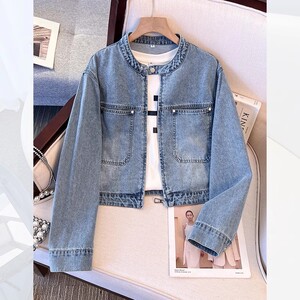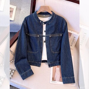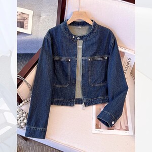 复古深蓝色正肩牛仔外套女士薄款2025年初春季新款小个子短款夹克