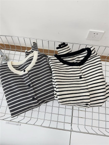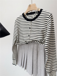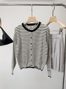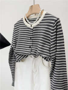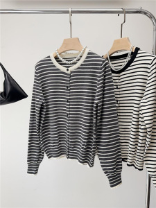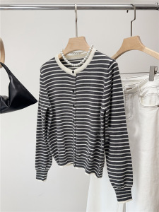 韩系圆领黑白撞色条纹针织开衫长袖2025早秋新款女装毛衣外搭上衣