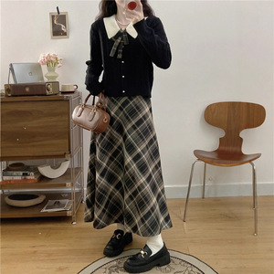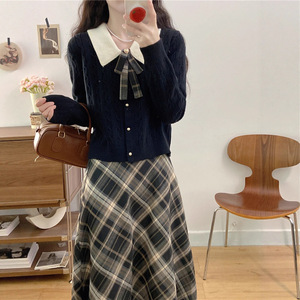 大码女秋冬新款高级感学院风可爱蝴蝶结撞色毛衣+格纹半身裙套装