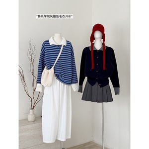 2025秋冬新款韩系潮百搭显瘦通勤撞色翻领条纹休闲毛衣开衫女