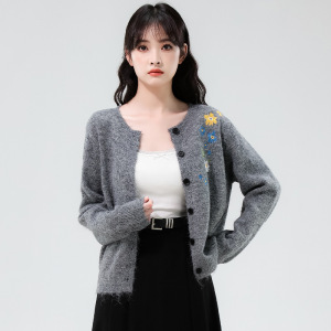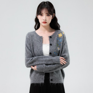 实拍2025秋季新款灰色圆领开衫毛衣女小花朵绣花长袖针织外套上衣