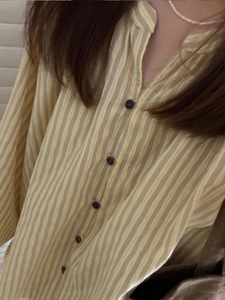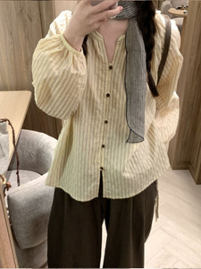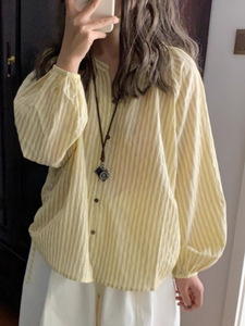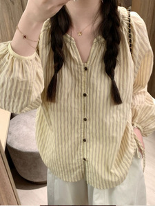 早秋日系双条纹棉长袖衬衫宽松复古上衣女