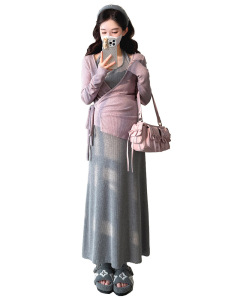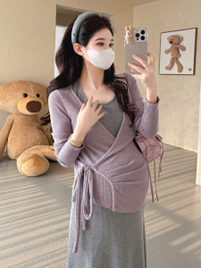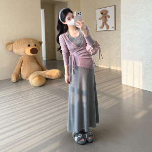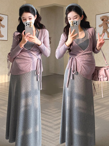 孕妇套装2025秋冬新款遮肚显瘦韩系绑带长袖上衣挂脖连衣裙两件套