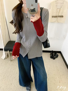 009 秋季新款慵懒风坑条纯色上衣薄棉长袖撞色打底衫女士弹力T恤