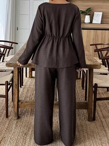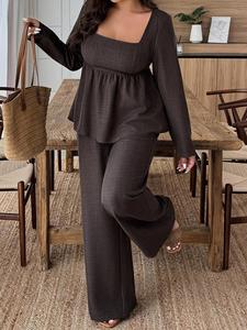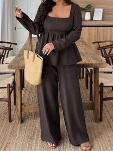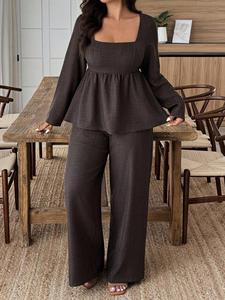 亚马逊跨境欧美大码女装套装方领春秋胖mm长袖上衣阔腿长裤两件套