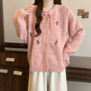 韩系温柔风甜美绣花毛衣外套女秋冬新款圆领系带蝴蝶结针织开衫