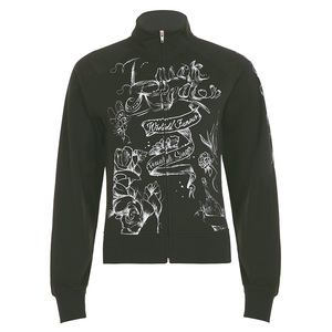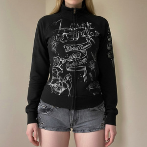 美式暗黑复古风手绘印花卫衣外套高领拉链开衫宽松版休闲上衣女装