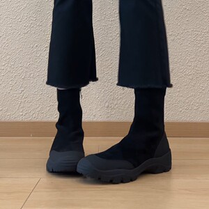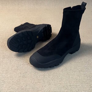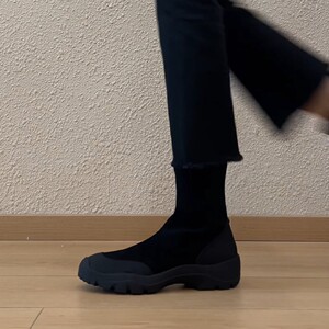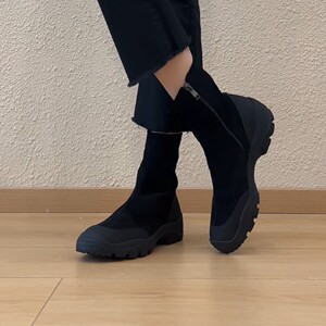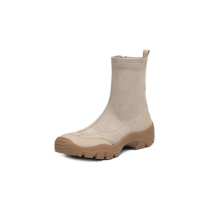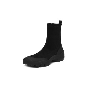 新品~手工真皮绒面大头圆头短靴女单靴弹力靴厚底防水台中跟舒适