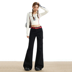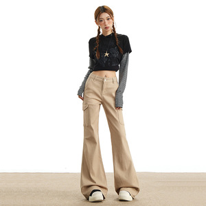 美式微喇牛仔裤女秋季新款设计感卡其色宽松显瘦阔腿工装喇叭裤子