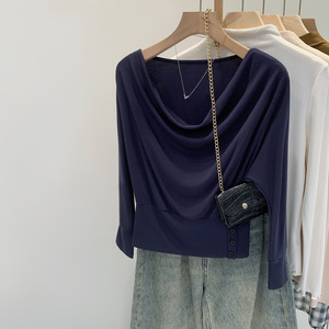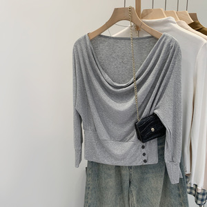 设计感别致灰色荡领长袖T恤女装潮2025秋季新款修身显瘦气质上衣