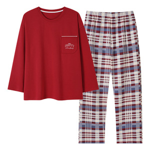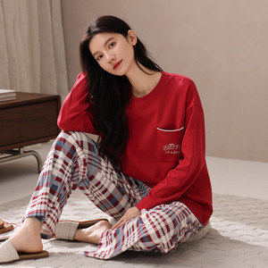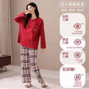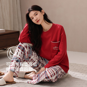 【带胸垫】抗菌棉睡衣女士纯棉长袖春秋季时尚红色家居服套装新款
