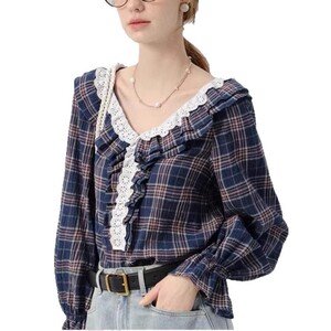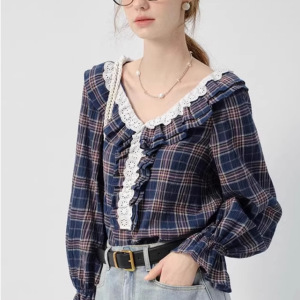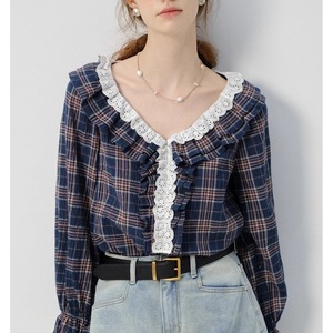 VEGA 法式花边拼接格子宽松长袖衬衫新款简约通勤显瘦V领减龄上衣