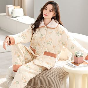 三层夹棉睡衣女秋冬季加绒加厚珊瑚绒2025新款碎花女士家居服套装