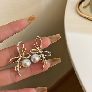 8#银针-金色-白色-14K真金电镀蝴蝶结锆石珍珠耳钉