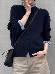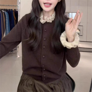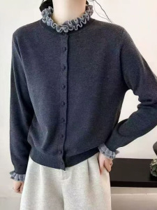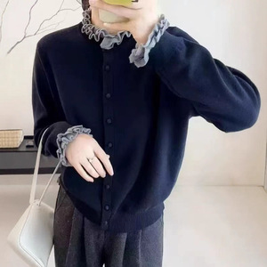 木耳花边气质针织开衫2025秋冬新款慵懒风圆领撞色毛衣外套上衣女