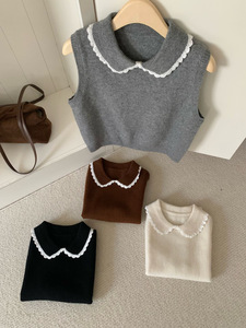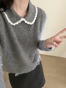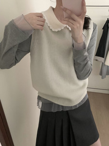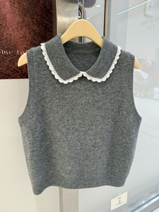 【之言】25秋韩系全羊毛优雅miu系蕾丝花边娃娃领叠穿背心针织衫