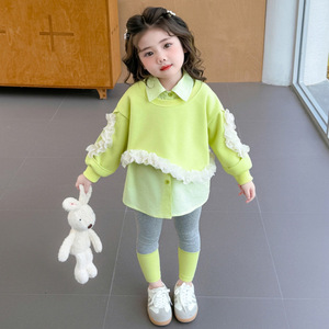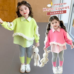 女童斜花边假两件衬衫套装秋季2025新款宝宝休闲弹力打底裤两件套
