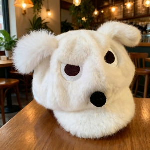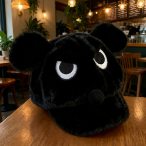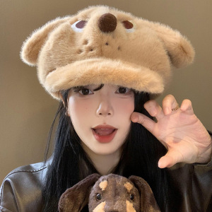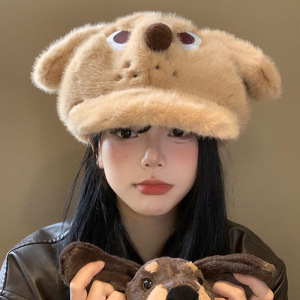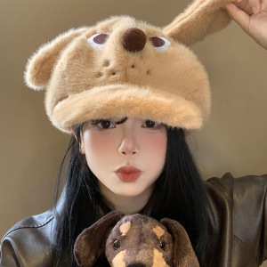 怒气小狗毛绒帽女秋冬季氛围感保暖棕色毛绒大版棒球帽可爱显脸小